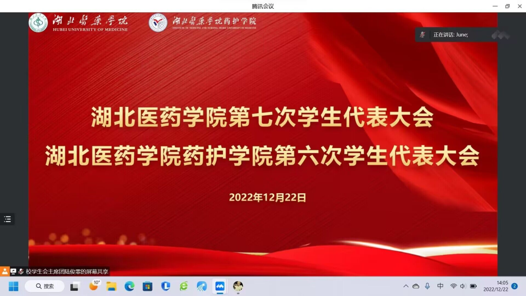 12月 22日 | 15:10— 16:10 | 第二次全体 会议 | 全体 代表 | 1、发起关于“学习贯彻中国共产党第二十次全国代表大会精神,争当新时代向上好青年”的倡议; 2、审议通过候选人产生办法; 3、审议通过选举办法; 4、审议通过监票人建议名单 5、介绍主席团候选人情况及候选人竞选演讲; 6、发放选票,投票选举; 7、宣布选举结果; 8、校团委陈璞书记为本次学生代表大会致闭幕词; 9、奏唱《校歌》,大会闭幕。 | 腾讯会议 | 郭俊 |