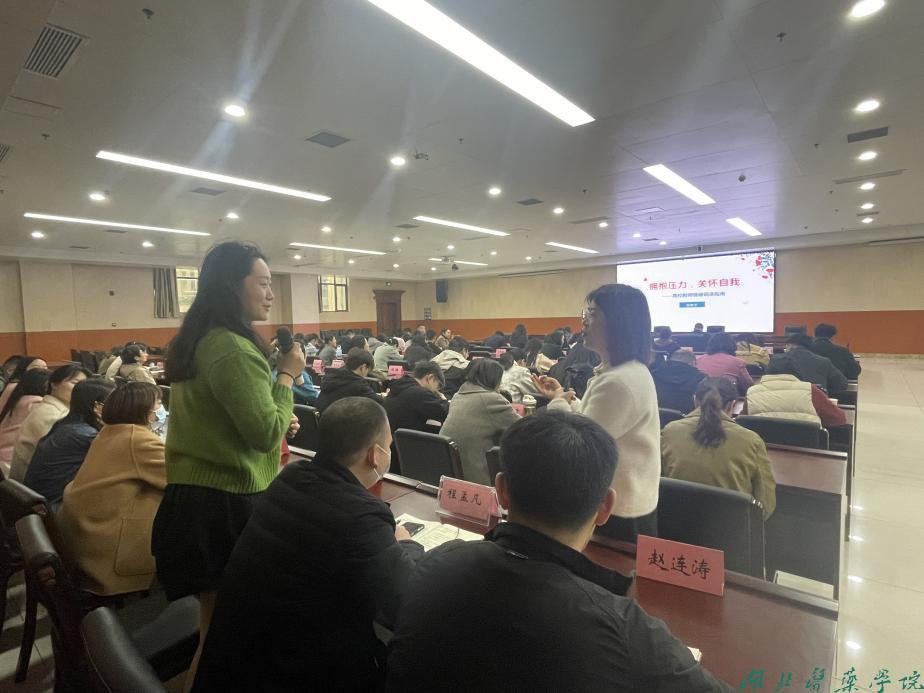武汉理工大学心理健康教育专职教师周树芝博士应邀作《拥抱压力,关怀自我》主题讲座,她围绕认识压力、压力的影响、拥抱压力和关怀自我四个方面展开讲解,并在讲座中穿插正念放松体验与分享环节,帮助老师们倾听内心声音,学会拥抱压力,积极关怀自我。